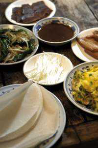 立春日吃春饼称为“咬春”。民间在立春这一天要吃一些春天的新鲜蔬菜,既为防病,又有迎接新春的意味。唐《四时宝镜》记载:"立春,食芦、春饼、生菜,号'菜盘'。"可见唐代人已经开始试春盘、吃春饼了。所谓春饼,又叫荷叶饼,其实是一种烫面薄饼--用两小块水面,中间抹油,擀成薄饼,烙熟后可揭成两张。春饼是用来卷菜吃的,菜包括熟菜和炒菜。昔日,吃春饼时讲究到盒子铺去叫“苏盘”(又称盒子菜)。盒子铺就是酱肉铺,店家派人送菜到家。盒子里分格码放熏大肚、松仁小肚、炉肉(一种挂炉烤猪肉)、清酱肉、熏肘子、酱肘子、酱口条、熏鸡、酱鸭等,吃时需改刀切成细丝,另配几种家常炒菜(通常为肉丝炒韭芽、肉丝炒菠菜、醋烹绿豆芽、素炒粉丝,摊鸡蛋等,若有刚上市的“野鸡脖韭菜”炒瘦肉丝,再配以摊鸡蛋,更是鲜香爽口),一起卷进春饼里吃。