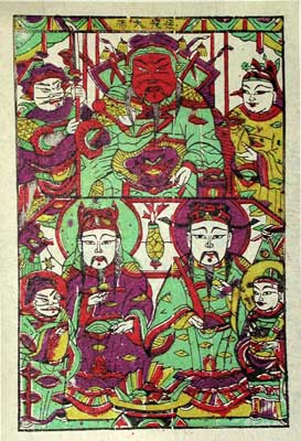 民间所供大多以赵公明居多,其印刷的形象很威武,黑面浓髯,顶盔贯甲,手中执鞭,周围画有聚宝盆、大元宝、珊瑚之类的图案,加以衬托,突出富丽华贵的效果。