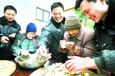 12月21日,郑州市公安局特警支队的一群青年特警队员带着饺子馅和饺子皮来到南曹乡敬老院,和这里的孤寡老人一块包饺子来迎接即将到来的冬至。(来源:新华网河南频道 河南日报报道) 而民间在春节期间吃饺子的习俗在明清时就已经相当盛行了。饺子一般要在年三十晚上12点以前包好,一部分吃年夜饭时吃,一部分待到半夜子时吃。而这时正是农历正月初一的伊始,吃饺子便有了“更岁交子”之意,“子”为“子时”,交与“饺”谐音,也包含着有“喜庆和谐”、“团团圆圆”、“吉祥如意”的意思。过年为什么要吃饺子?在民间有很多关于饺子的传说。一说是为了纪念盘古氏开天辟地,结束了“混沌”状态;二是取其与“浑囤”的谐音,意为“粮食满囤”。另外,在民间还流传吃饺子与女娲造人有关。女娲抟土造成人时,由于天寒地冻,黄土人的耳朵很容易冻掉,为了使耳朵能固定不掉,女娲在人的耳朵上扎一个小眼,用细线把耳朵拴住,线的另一端放在黄土人的嘴里咬着,这样才算把耳朵做好。老百姓为了纪念女娲的功绩,就包起饺子来,用面捏成人耳朵的形状,内包有馅(线),用嘴咬吃。所以,北方在冬至这天吃饺子应该就是源于这个传说。