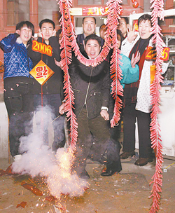 当午夜交正子时,新年钟声敲响,整个中华大地上空,爆竹声震响天宇。在这“岁之元、月之元、时之元”的“三元”时刻,有的地方还在庭院里垒“旺火”,以示旺气通天,兴隆繁盛。在熊熊燃烧的旺火周围,孩子们放爆竹,欢乐地活蹦乱跳,这时,屋内是通明的灯火,庭前是灿烂的火花,屋外是震天的响声,把除夕的热闹气氛推向了最高潮。历代的诗人墨客总是以最美好的诗句,赞颂新年的来临。王安石的《元日》诗: