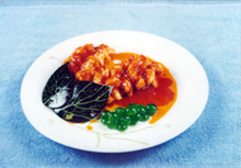 ④青菜叶用滚水烫过,切成葡萄叶及梗的形状,镶在鱼肉旁,使成带枝葡萄状。