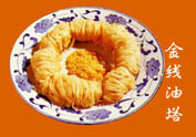 ?金线油塔是古城西安的一种传统名贵小吃。它层多丝细、松绵不腻,其形状“提起似金线,放下像松塔”,故而得名。相传始于唐代,原名“油塌”,清代时有了改进,选用上等面粉、猪板油等原料,增加油饼层次,把饼状改为塔形,将烙制改为蒸制,名称也由“油塌”改为“金线油塔”,成为上乘美点。油塔蒸好下笼食用时,用手略加拍折抖松,放在盘里,佐以葱节、甜面酱等,别有风味。