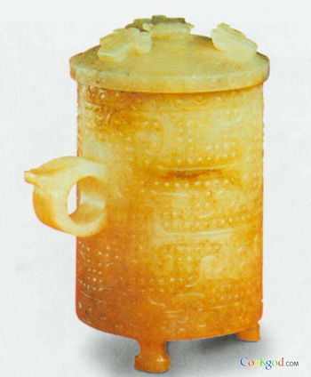 卮,是一种酒器,产生于战国末期,秦时杯卮并行使用,流行于汉代。据《史记·项羽本纪》记载,鸿门宴上,项羽赐樊哙酒,用的便是卮。《汉书·高帝纪》说:"上奉玉卮为太上皇寿。"东汉应劭说:"卮,饮酒礼器也。"汉代以后,酒卮少见,但仍没有绝迹,唐人颜师古说:"卮,饮酒圆器也,今尚有之。"宋范成大《四时田园杂兴六十首》诗云:"乾高寅缺筑牛宫,卮酒豚蹄酹土公。"看来,酒卮流行的时间很长,到唐宋时期仍有人使用。但是汉代以后的酒卮实物发现的很少,明代玉匠陆子刚的青玉酒卮酷似汉代的玉卮(樽),当是仿古之器。