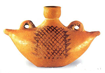 该器为1958年陕西省宝鸡北首岭遗址出土泥质红陶,口部呈杯状,器身横置,上部两端突尖,颇像一只小船。在两侧的腹部,各用黑彩绘出一张鱼网状的图案,鱼网挂在船边,似正撒网捕鱼,又像小船刚刚捕鱼回来,在晾晒鱼网。陶壶上端两肩上,横置两个桥形小耳,既便于提拿,又可穿绳背负,随身携带。