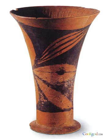 觚本身是饮水、饮酒之器,最早产生于新石器时代中期。陶觚从新石器时代一直沿用到商代晚期,铜觚出现于商代早期,盛行于商代中、晚期,西周早期仍有人使用,但已不是主流。陕西省长安县普渡村西周墓中出土的铜觚,风格与商代晚期铜觚酷似,大概是流传下来的商代晚期旧物。铜觚、爵、斝是商代青铜酒器的基本组合,但从组合关系上看,觚作为一种酒器,不可能取代斝的温灌功能,也不会代替爵的饮用功能。从历史的角度看,觚宜做饮器,若从实际应用方面考虑,也许它还兼具温、灌、饮用之多重功能。这件彩陶觚,制作精美,彩绘细致,颜色鲜艳,是新石器时代大汶口文化不可多得的酒器珍品。