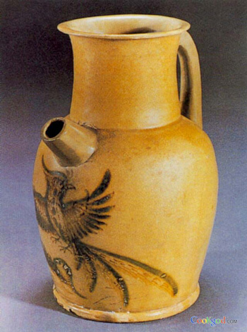 此执壶1983年出土于湖南省望城县古城村,口沿外侈,筒状粗长颈,溜肩,长圆腹,平底假圈足,肩部一侧置八棱形短流,对称一侧置曲柄与颈相连。如此造型,端庄古朴,是典型的长沙窑执壶形象。通体施青釉,釉色青中闪黄,釉面开细小的开片纹,壶流下方的腹面有褐绿彩绘飞凤纹样,凤凰作回首展翅飞翔状。壶体纹饰用笔简洁,线条流畅,神态生动逼真,可见晚唐时花鸟画技之高超。在望城县古城村还出土一件与此壶形状相同的执壶,腹两侧绘红、绿彩写意纹样,被淡雅的青釉衬托,宛如空中的彩虹一般,煞是好看!