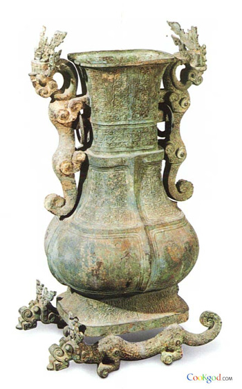 英文名称:Bronzerectangularhuwithdragon-shapedhandleandtiger-shapedleg