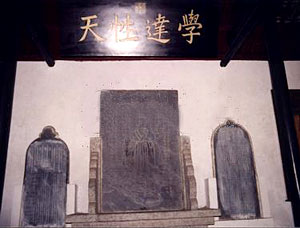 在朱子祠前,与礼圣殿并列的是一座两层楼阁,即“御书阁”。它是清代康熙皇帝赐给书院匾额及古书后, 由南康知府周灿请建的。阁前有桂树两株,相传是朱熹手植;但也有人说是清代建造“御书阁”时种植的。这里古树浓荫,阳光穿过树隙在地面上洒下斑驳的小光圈,风吹树动,光影摇晃,有如微波荡漾的湖水,显得环境清幽,风景宜人。