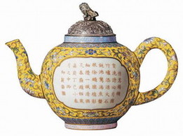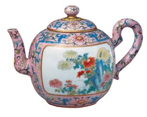 清乾隆粉地粉彩开光菊花纹茶壶,故宫博物院藏。