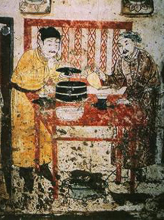 见于河北宣化下八里村6号墓辽代壁画。壁画中共有6人,一人碾茶,一人煮水,一人点茶,反映了当时的煮茶情景。