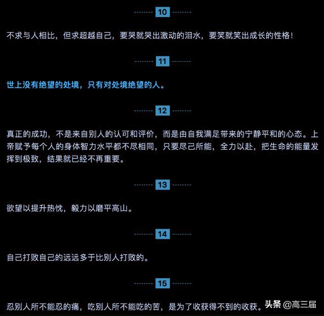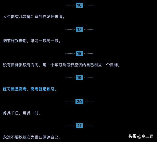 正如有句话:“沿着这条路一直朝前走,在不远的地方就会有一个路口,你可以向左转,也可以朝前走,但是你不能停留。”这三十句话,送给所有在高三前进路上迷茫的你。