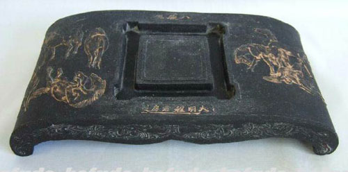 八骏砚正面“八骏砚”是大明时期程君房专制。相传当时只制作了四块,专为皇帝所独用。明代是我国国学走入国家体制的时期,统治者为培养种类人才,国学教育很昌盛。而程君房瓦砚是采用两汉、魏晋、南北朝流传下来不多的朝殿瓦工艺,它参考未央宫砚,是专门给皇帝制作的藏品。因此,大明皇帝为了体现自己对教育,对人才的关爱、厚爱。就令程君房制作做了四块“八骏砚”。