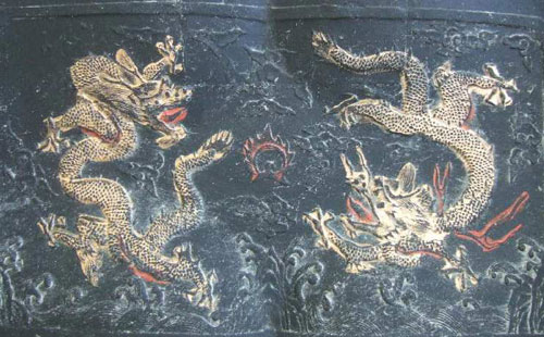 “八骏砚”,长28厘米,宽16厘米,高3厘米。正面取意八匹神态可赞的骏马,在中间用类似四个柱子顶起,成为四方围砚,中心形似皇帝的案台。寓意者,国家保护国学,广泛吸引人才。“骏”为才子、骏杰。八骏马跃画在砚堂上,图取意容天下各方英才。当时,皇帝称“万”,太子称为“千”,把骏杰称“八”,其地位之高是少有的。“八骏砚”采用皇帝案台形状,寓意着皇帝爱护骏杰。在砚底部,二条金龙飞腾,在“八骏砚”两侧四只凤凰环围“寿”字,象征着龙在下,凰在侧共为“骏杰”托底、护边,让英骏的马能真诚服务国家。在历史的文物中,把真龙和玉凤放在作品底部和两侧砚边是极其难见的,也说明大明皇帝之初,个人的气魄和对人才的重视。