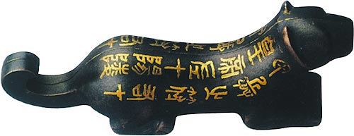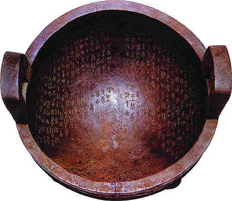 铸刻在青铜器上的金文,与甲骨文差不多同样古老,它的笔画比较粗壮,大小也比较匀称。图为毛公鼎及铭文。
