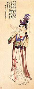 《长生殿》是一部爱情悲剧的巨大著作。叙述唐明皇在开元以后,纵情声色,委政权奸,国政日非。杨贵妃恃宠善妒,杨国忠招权纳贿,激起拥有重兵之番将安禄山。称兵造**。哥舒翰潼关不守,兵败降贼。明皇束手无策,仓皇幸蜀,逃至马嵬曙,随行将士杀死杨国忠,陈元礼纵兵逼哄,贵妃佛堂自缢,摇摇将坠的大唐江山到此才获得一线转机。是作者通过民间传说中唐明皇和杨贵妃有着真挚爱情的故事,更根据历史把他们的爱情在现实中所发生的坏的政治影响而写出的。此后便摭拾白居易的长恨歌;唐人小说玉妃归蓬莱;元人杂剧等故事,写出唐明皇对于杨贵妃的怀念,以及二人原系天仙,谪居人世,终于回到天宫,永为夫妇作结。(左为张大千名画《杨贵妃》)
