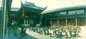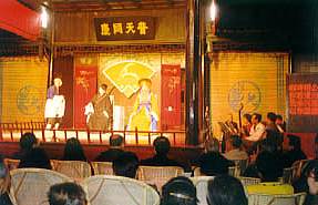 在古典戏台中,还有一种是属于私家或官宦们宴饮娱乐之用的。现维护完好、硕果仅存的只有一座。当你走进东北街的苏州博物馆内,在靠东的厅堂内,就能看见一座油漆得光彩夺目的戏台,布置得精巧、典雅而舒适。戏厅的平面为“目”字形,由前厅、正厅、后厅三部分构成,戏台设在正厅后方。台高齐腰,十步见方,四周围着护栏。台的上方用红绸作幔,丝须飘垂。戏台后部有月洞门,为雕镂精细的银杏屏墙。面向舞台有左右两门,分别写着“出将”、“入相”的门额,配上绣花帘幕,色彩缤纷。这座戏台堪称苏州现存古典戏台中别具一格的古建筑艺术珍品。此台约建成于晚清时期,相传是当时达官显宦在此宴饮憩息之所。民国初年,苏州创办“昆曲传习所”,也经常在此作专场演出。近代著名昆曲艺术家俞振飞,1983年来苏州演唱昆剧,曾有《忆旧游》一词写道:“闲情枉抛多少,都付笛中声。算粉墨衣冠,当场学步,七十年前……”细细品味这首词意,彷佛犹能听到一阵阵清丽典雅的昆腔音韵、箫管婉约,使人陶醉在朦胧而美妙的意境之中。 (孙鹄)