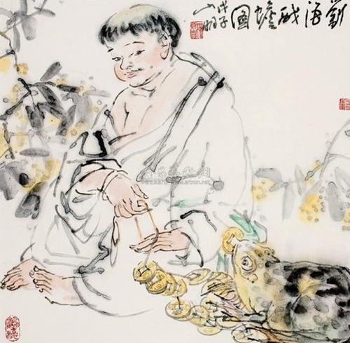 据清初《坚瓠五集》记载:刘海戏蟾,“举世无不知其名者”,“今画蓬头跣足嘻笑之人”,即刘海也,“持三足蟾弄之”。
