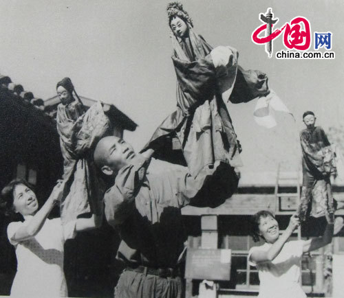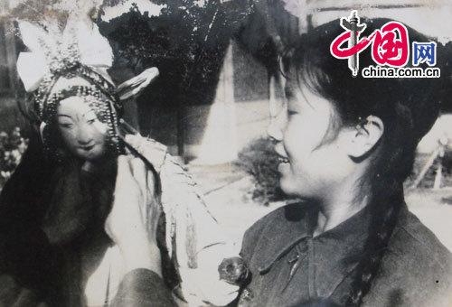 早年龙凤云学习陕西民间木偶艺术《锯大缸》 途中右侧女子为龙凤云