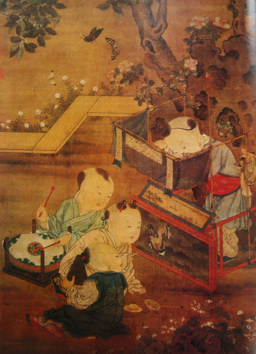 ?宋? 《傀儡戏婴图》 台湾故宫博物院藏由于木偶戏具有“以物象人”的特殊表现形式,故需要将操演者遮挡起来,从而决定了木偶戏舞台当有特殊的结构。尽管有的仅仅用一块帷幕,但它却是木偶戏表演的关键。一般的木偶戏舞台,具有遮挡操演者,分隔表演区,观赏区,突出木偶及集中观众视线等各种功能。现藏中国历史博物馆的宋代传世文物《傀儡戏纹镜》,以及清代《百婴图》中的木偶戏舞台形式,均显示出了木偶戏舞台的特殊性及其最基本的舞台概念。再如台湾故宫博物院收藏的宋画《婴戏图》,描绘了宋代悬丝傀儡的表演情况;它以倒下的桌子侧边作舞台面,装以支架,挂上幕条,框成舞台口,后边有遮挡操演者之帷幕,构成了模拟传统悬丝傀儡的舞台。画面描绘的婴戏场面,显然与真正的演出不尽相同,图中把乐手置于台前,乐器仅为板、鼓,一婴持线板操纵傀儡。宋代的悬丝傀儡已流行广泛,并深入于儿童生活中。