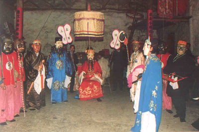 贵池傩戏演出为三段体,即傩仪、傩舞——正戏——傩舞、吉祥词。也就是在正戏的前后,必须有“请神”和“送神”仪式,如“迎神下架”、“送神上架”、“请阳神”、“朝庙”等。