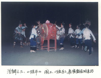 “椎牛”,发端于父系社会初期。它以崇苗祖祭苗魂为主要目的。请的先师是苗巫。以群体“独乐”(跳鼓)为娱神手段。按习俗,主家必邀请一群漂亮的苗女,舅辈亲一方必请一批英俊的苗男,汇聚鼓场,歌舞娱神,并重演当年群婚习俗[图2]。“男女各有赠馈,甚至乘夜偕赴林间,为桑中濮上之行亦不较”。