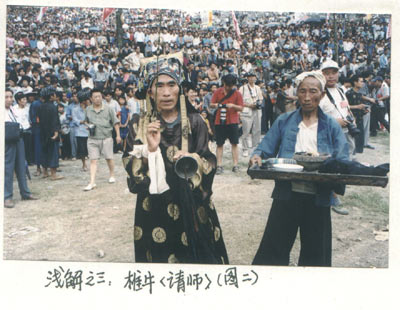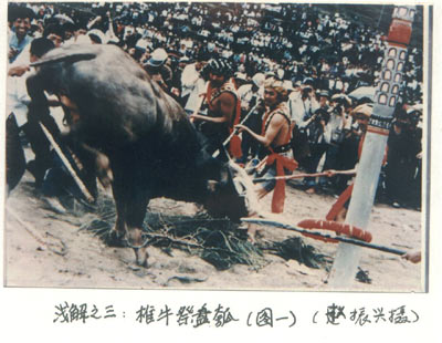 一块坪地之中,五彩神柱之下,一头水牯环绕突奔,一群握着梭镖的杀手迅猛地向那水牯刺去[图1]。祭牛倒地,属于同舅辈叔伯亲便瓜分牛肉,数百乡民跳鼓对歌通宵达旦。这就是苗族的椎牛祭,苗语叫“弄业”(即吃牛或“吃牯脏”)。雍正七年“改土归流”之前,祭祀长达十四个昼夜。迄今,全堂法事仍有二十余堂,“剽牛”只是其中的一堂。其目的是迎接祖神,请他们回到苗寨与子孙团聚,禳灾赐福。所祀主神为盘瓠。按仪式程序先后有:敬雷神、祭蚩尤,祭主家祖先;敬大舅爷、二舅爷茶酒;杀鸡祭天;献九杯酒九碗肉给玛媾;跳鼓;敬神农;敬盘瓠;求财等节目。