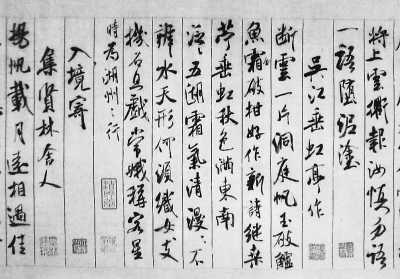 米芾早年学唐人书,32岁得到苏轼的指点,专学晋人。米芾行书成就最高。他的行书,结体耸峙,字形欹侧,法度整然,却又活泼生动,神采飞扬。米芾形成自己风格的标志性作品是《蜀素帖》。蜀素是蜀地制造的一种丝织品,在上面书写方寸大小的行书,运笔慢则容易洇为墨猪,运笔快则点画枯槁。米芾在蜀素上写行书,运笔能侧能正,时纵时敛,笔势仍然振迅有力,与纸上作书一样挥洒自如。
