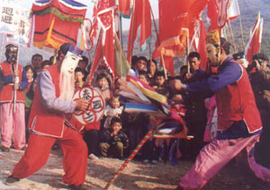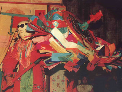 伞(繖)舞是明代的称谓,宋代称“竹竿拂子”,隋代称“拂舞”,汉代称“灵星舞”,先秦称“绂舞”,是祭祀土地神的舞蹈,其历史十分悠久。在贵池的傩戏演出中,面具被视为神的载体,伞永远离不开面具,伞的天盖作用十分明显。古人视傩戏表演为神灵降临,所以演出前必须将伞带往社坛迎神,而且第一个傩舞便是舞伞。