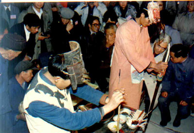 三、劝圣。请神灵享受供品。供:猪肉、猪头、尾、内脏及鸡、鸭、酒等12荤熟“浊筵”。