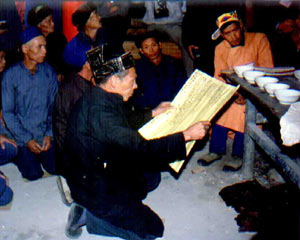 一、请圣。供放茶叶、柑桔、甘蔗、芝麻、黄豆等十二素“清筵”。由师傅逐一念唱36位神名,同时由另一穿法衣、戴线光童子面具的师公作舞,表示所敬请的神灵已降临祭坛。