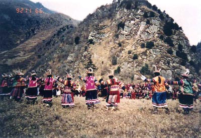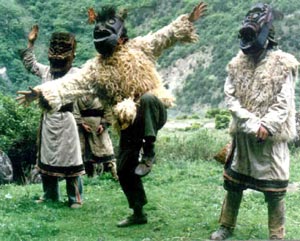 两个传说,一叙述山神的来历,一叙述兽面舞的成因。每到春节正月初四至初五祭祀山神的日子,各地白马人倾寨出动,由“白莫”(白马语,即祭师)率领,前去神山朝拜[上图]。朝拜的仪式程序和内容,各地略有不同。朝拜的队伍里,有些人反穿黑色或白色羊皮衣,头戴粗犷、笨重具有个性美的兽头面具。其中最为突出的是黑熊面具,白马人称为“达纳斯杰”。“达”义为熊,“纳”义为黑,“斯杰”义为神灵,