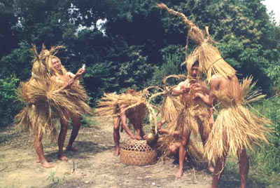 “毛古斯”在分配猎物前要以“生殖器舞”取悦女神,以求荫庇全族:表演人员各配备一根长棍,顶端用土红的汁水浸染。人们把这象征男阳的道具,称为“粗鲁棍”。演至高潮,毛古斯可用粗鲁棍随意触及女观众的身体。女方认为,这是神赐自己多生子女而高兴。
