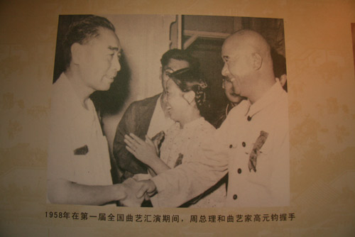 1958年在第一届全国曲艺汇演期间,周恩来和曲艺家高元钧握手