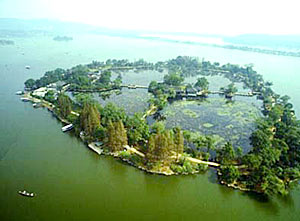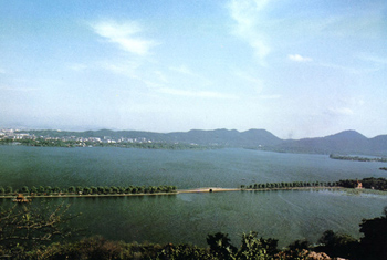 西湖位于浙江杭州之西。西湖风景妩媚,早在南宋即出现“西湖十景”,经过历代妆点,使江湖、山林、洞壑、溪泉、春华秋实、夏荷冬雪等自然之胜与古刹丛林及造园家的雕凿融为一体,正如苏东坡诗:“水光潋滟晴方好,山色空蒙雨亦奇;欲把西湖比西子,淡妆浓抹总相宜”。秀丽的西湖,三面环山,一泓碧水,以具有东方艺术风格的巨型山水盆景著称于世。