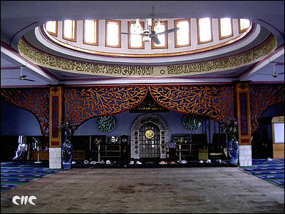 南关清真寺内景在西北黄土高原茫茫的金色海洋中,奇迹般地展现着偌大一个绿岛,这就是富饶美丽的塞上江南宁夏川。在这绿岛中央矗立着一座高楼如林,胜景如画的城池,这就是宁夏回族自治区首府、著名的塞上古城银川市。