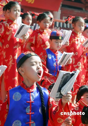 在福建泉州文庙举行纪念孔子诞辰2556年仪式上,小学生颂读《三字经》。