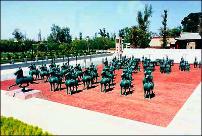 雷台汉墓则因为发现了一处东汉晚期的大型砖石墓葬并出土了文物珍宝而出名,雷台是古代祭祀雷神的地方,因在一高约十米的土台上建有明朝中期建造的雷祖观而得名。出土文物中的铜奔马艺术价值最高。铜奔马又称马超龙雀,呈发绿古铜色,马高34.5厘米,长45厘米,重17.5公斤,马呈飞奔状,三足腾空,昂首扬尾,右后足下踏一展翅奋飞回首惊视的“风神鸟”龙雀,改变了传统天马的造型手法,又符合力学平衡原理,蕴含丰富的天马文化内涵,铸造技巧精湛,堪称青铜艺术极品。