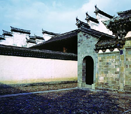 卢宅位于浙江东阳县城东门外,建于明景泰七年(1456年)至天顺六年(1462年),其后又不断修建而成一区规模庞大的住宅群体。全宅占地约5公顷,由十余组按南北轴线布置的宅院所组成。主轴线沿照壁穿过三座石牌坊转折至肃雍堂、乐寿堂而止于世雍堂。住宅周围有河流环绕,通过跨河的九座桥梁而沟通宅内外联系。宅前大道西通东阳城东门。从门前众多牌坊可知,这是一处世代为官的家庭聚居地。肃雍堂是全宅的主厅,其布局和曲阜衍圣公府相似,前有门屋两重,堂前两侧设东、西厢。肃雍堂平面作工字形,以穿堂将前后二堂联结成一体。其中前厅原是歇山屋顶,后虽改为两厦悬山顶,但室内木构架仍保留歇山转角做法,斗拱式样也很华丽。按明制规定,品官住宅不准用歇山顶,因此肃雍堂前厅的屋顶改形是否系宅主为逃避“逾制”之罪而采取的补救措施?这种现象在明代住宅中甚为罕见。