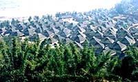 当雾霭慢慢散去时,傣族村寨也渐渐显露出它的轮廓。一棵棵高大的椰子树、芒果树、棕榈树,一片片香蕉林、灌木丛,特别是寨子周围的那些挺拔的竹林,形成一片浓密的绿荫,簇拥着一座座造型古朴别致的傣家竹楼。远远看去,仿佛一座绿色的小岛。在云南省西双版纳傣族自治州,我所见到的傣族村寨都是这样。
