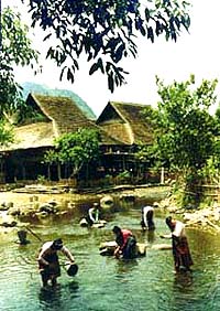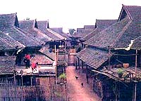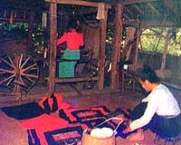 事实上,在我所到过的傣族寨子里,名副其实的竹楼已所剩无几。现在,绝大多数的竹楼应该叫作木楼,甚至有的竹楼的木桩也被砖或水泥之类的建筑材料所代替。这情景对于我这个企图寻觅古老民族的淳朴风俗的人来说,或多或少是种遗憾,但我又不得不为人类文明的进步感到欣慰。还好,在我走访了十几个村寨之后,我终于见到了一座真正的竹楼。竹楼的主人是一位六十来岁的老太太,当时她正在一架古老的织布机前织布,身边的箩筐里放着各种颜色的棉线。她不停地在布机上换着梭子,布机上便出现了一道道的彩条。她告诉我,这种布是专给老年妇女做筒裙用的。