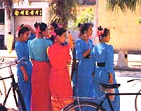 傣族村寨里另一件让我感到新奇的事,是每个寨子里都有一座寺院,当地人称之为缅寺。缅寺一般座落在寨子的中央,显得很高大。大殿香烟缭绕,经幡高悬,透出一种庄严肃穆的气氛。可是当我看到寺里的和尚都是七八岁、十几岁的孩子时,我又感到一种困惑。原来,傣族的男孩一般都要在缅寺里度过一段修行的生活。至于多大年岁来,修行多少年完全自愿。一个14岁的小和尚十分腼腆地对我说,他进寺两年了,学到了傣文,而且随时可以回家,在这里挺好玩的。当然,在寺里也要干活,比如洗衣服做饭。看上去这些小和尚并不脱俗,虽然他们身披黄色袈裟俨然一副出家人的打扮,可在寨子里,在通往城里的马路上,在西双版纳自治州首府景洪的街道上,几乎到处都可以看到三五成群的小和尚:他们拉着妹妹的手在玩耍;他们坐在母亲自行车的后架上进城;他们和做买卖的小贩讨价还价;甚至有一次我还看到一个小和尚站在一家花店里,望着一束束的鲜花出神。