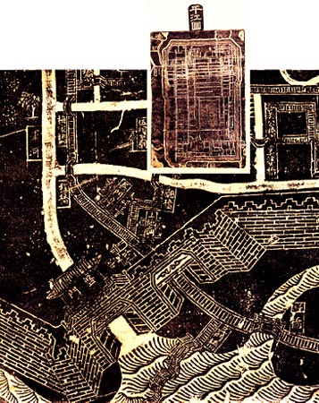 平江是苏州的前身,位于富饶的江南平原地区,扼南北交通要道,南宋时代为地区性的行政中心,手工业、商业繁荣。现存《平江图》碑,记载了当时该城的平面布局。城市为长方形,南北长4公里,东西宽3公里多,城墙上开有五门,是一座水网城市,设有水、陆两套交通系统。城内有大河,南北四条,东西三条,它们都与城市干道平行。另外还有一些小河、小街,共同构成城市的交通网络。商店、住宅多为前街后河,水陆交通方便。城外有护城河围绕,既可作为防卫之用,又是水运交通线。
