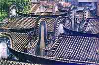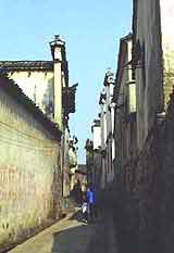 我访问巷里第一户人家时,户主胡老太太热情地领我观看了她家的住房。这是典型的传统的三间两廊式住宅。所谓三间,是居中的厅堂和两侧的居室。居室与厅堂间有天井,天井两旁为廊,廊门与街道相接。开门的一侧廊房一般作卧室,另一侧廊房多作厨房。在堂屋的门檐下有一陈旧的长条红木板,上面雕有花卉、鸟兽等,图案仍十分清晰。堂屋里除了个别的生活用品之外,其余全是旧式的红木家具。