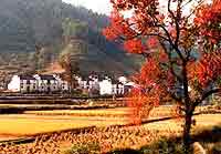 还有一个古老的村落叫李坑村。它建于北宋年间(公元960-1127年),有100多户人家。一条小溪将村庄截成两半。两岸的住户隔水相望,每隔20米左右,就有一座小木桥或石桥相通。我们走进一家屋顶雕有狮子头的民宅, 从前厅去后厅时,发现还有个别致的小庭院, 中间是一个5米见方的鱼池, 池边靠着正屋建有观鱼阁,是主人一家消遣之处。院内有一棵很老的桂树和一棵紫薇树,根据村谱的记载,那棵紫薇树已有800多年的树龄了。主人说,这棵树年年萌发新枝,红花满树,被村人称为“花神”,所以备受珍爱。