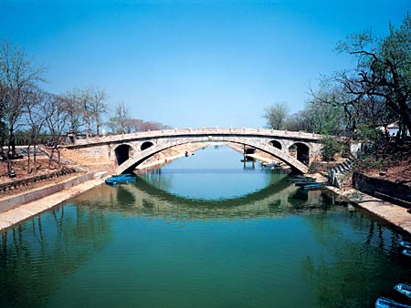 隋唐二代在桥梁建设上有较大成就。隋在今河北赵县的南交河上修建安济桥,这是一座单拱敞肩石桥,桥的净跨度37.02米、矢高7.23米,由二十二道厚1.03米的石拱并列组成,在桥拱两端的桥肩处又各砌二小拱,其馀再用石块填砌,既减轻桥之重量,也有利於洪水时排水。这种做法是隋代造桥上的创造,比欧洲早一千二百年。唐代大河上的桥,由国家修建管理的共十一座,有浮桥、石桥、木柱木梁桥等,最大的是在今山西永济的蒲津浮桥,横跨黄河,通至陕西朝邑县,长300米左右。此桥原用竹索连锁数百条船而成,屡遭洪水及冰凌破坏,唐玄宗开元十二年(724年)把竹索改为铁索,又在桥两端各用生铁铸造四头铁牛、二座铁山。每头铁牛重约七十吨,腹下有铁柱入地3米左右,用来锚固铁索。铁索强度大於竹索,浮船间距可以加大,也可减轻洪水、冰凌的危害。建造此桥有大量的铸铁、锻铁作业,耗资巨大,是由唐玄宗决策兴造的巨大工程,在中国古代桥梁中是应该载入史册的。