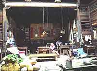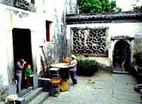 不知不觉已近中午,热情的当地人邀我们共进午餐。趁主人准备之际,我又对这幢建于康熙年间(公元1662—1722年)的古屋进行了一番观察。与其它的宅院类似,推开古宅的大门即是一个长方形天井(宅院中的露天空地),梁枋柱础雕镂十分精细自不必说。上厅正面挂有中堂、对联,还有红底金字的木质漆联,两侧是书画条屏。条几上摆放着一个古老的瓷瓶和一面镜子、一座自鸣钟。厅上是八仙桌、太师椅,还有高腿铜痰盂和古老木质排扇。步入内室,只见长条桌上放着文房四宝、古瓷帽筒,一切显得那样古雅清净……