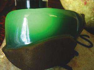 一些种水好但颜色不好的翡翠原石,就会采用染色的手法,在翡翠原石上弄个切口,然后涂上绿色原料,然后再将切口缝合。