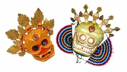 西藏面具工艺品除了吸收外来文化外,主要是受到西藏本土的原始宗教一苯教文化的直接影响。由于久远的苯教信仰在吐蕃先民心中有着根深蒂固的地位,因而佛教和苯教在相当长的时间内处子并驾齐驱的局面,结果两种文化既相互竞争又相互融合。尽管最后佛教战胜苯教而形成既不同于印度佛教,又不同于中原佛教的独特宗教,人们称“藏传佛教”或“喇嘛教”。印度高僧莲花生大师用佛法神威降服苯教神祗时,为了在民众中赢得广泛的信徒,同时将苯教中的巫术、妖法、火祭、梵魔等仪式连同鬼怪精灵一起带入“佛门”。苯教中的山神、年神、龙神等“世间神”,以日赞(山妖)、夺锥(骷髅)、帕姆(女鬼)、贴龙(独脚鬼)等等,这些土生土长的纸鬼率,也理直气壮的进入佛教护法的行列,成为西藏面具制作的一个重要组成部分。