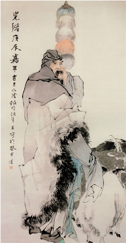 在任颐的笔下,苏武的形象既是悲壮的,又是崇高的。画面上站着的苏武,也有席地而坐的苏武,头裹巾,身披风衣,手执使节,忠贞不屈,气宇轩昂,严肃悲壮。成天与他为伴的只有一根使节,他拿着使节放羊,抱着使节睡觉。他相信:总有一天拿着使节回到汉朝。