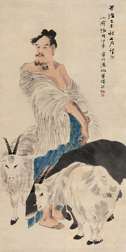 《苏武牧羊》是任颐反复描写的历史故事画。《汉书·苏武传》中记载:苏武,字子卿,曾奉汉武帝命以中郎将身份出使匈奴,单于欲降苏武,苏武不屈,被留放北海(今贝加尔湖)长达十九年,苏武“杖汉节牧羊,卧起操持,节旌尽落”,表现了强烈的爱国精神。作为出身于市民,又一度随太平军转战的任颐,面对加速殖民化的国土,深感“身居十里洋场,无异置身异域”,甚至寄希望于“草莽英雄”,正是这种思想驱使他在画中寄托忧患意识,歌颂高尚的爱国情操。